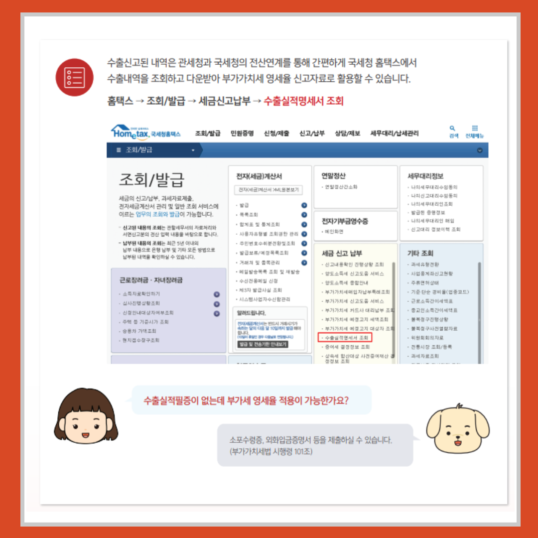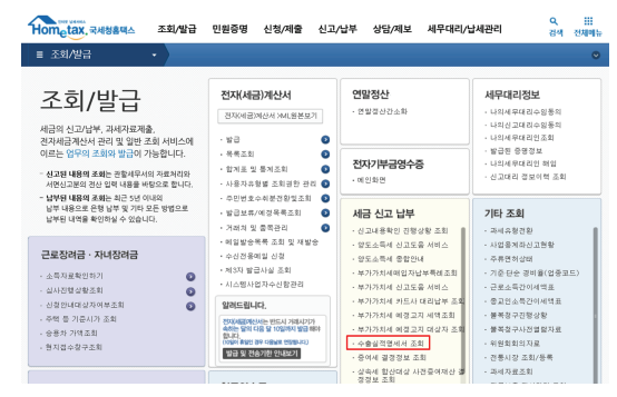 홈택스 → 조회/발급 → 세금신고납부 → 수출실적명세서 조회