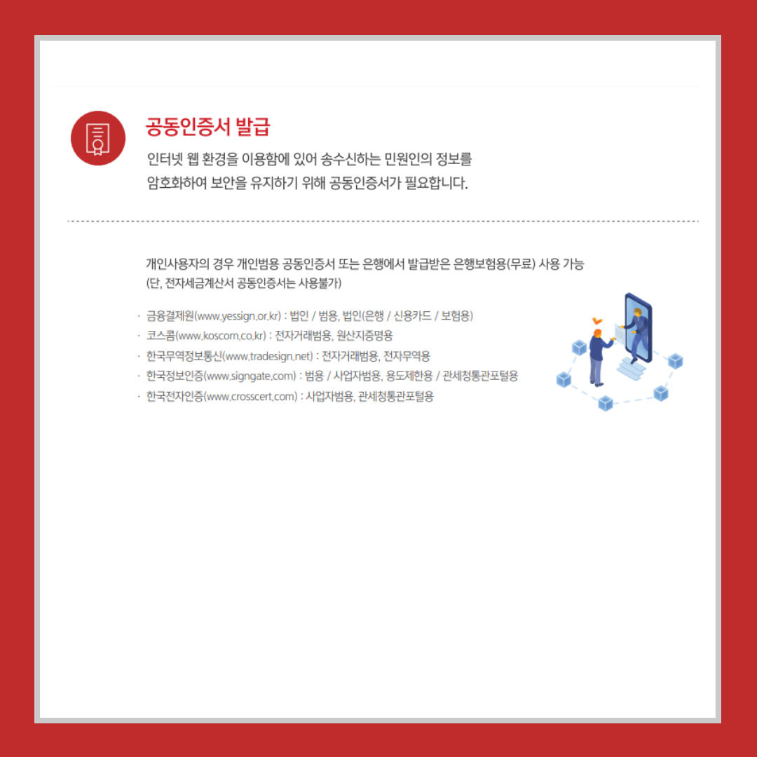 · 한국전자인증(www.crosscert.com) : 사업자범용, 관세청통관포털용