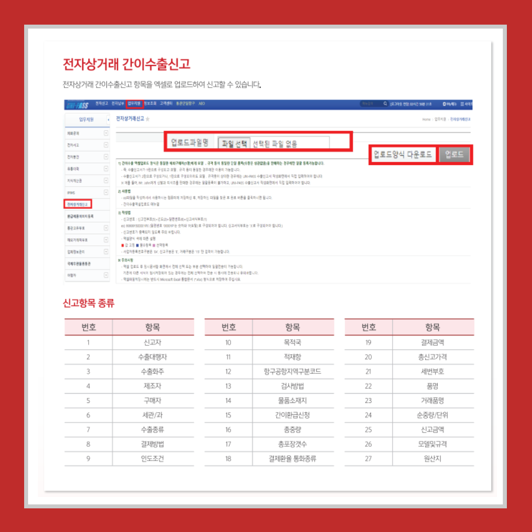 ○ 전자상거래 간이수출신고 항목을 엑셀로 업로드하여 신고할 수 있습니다.