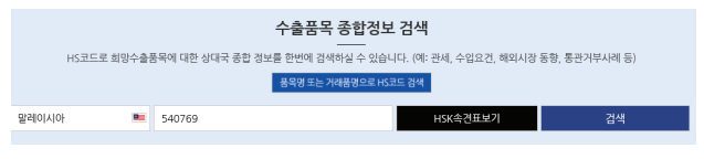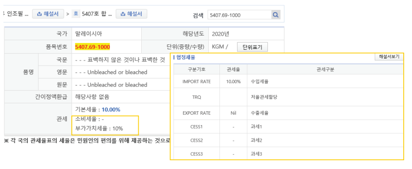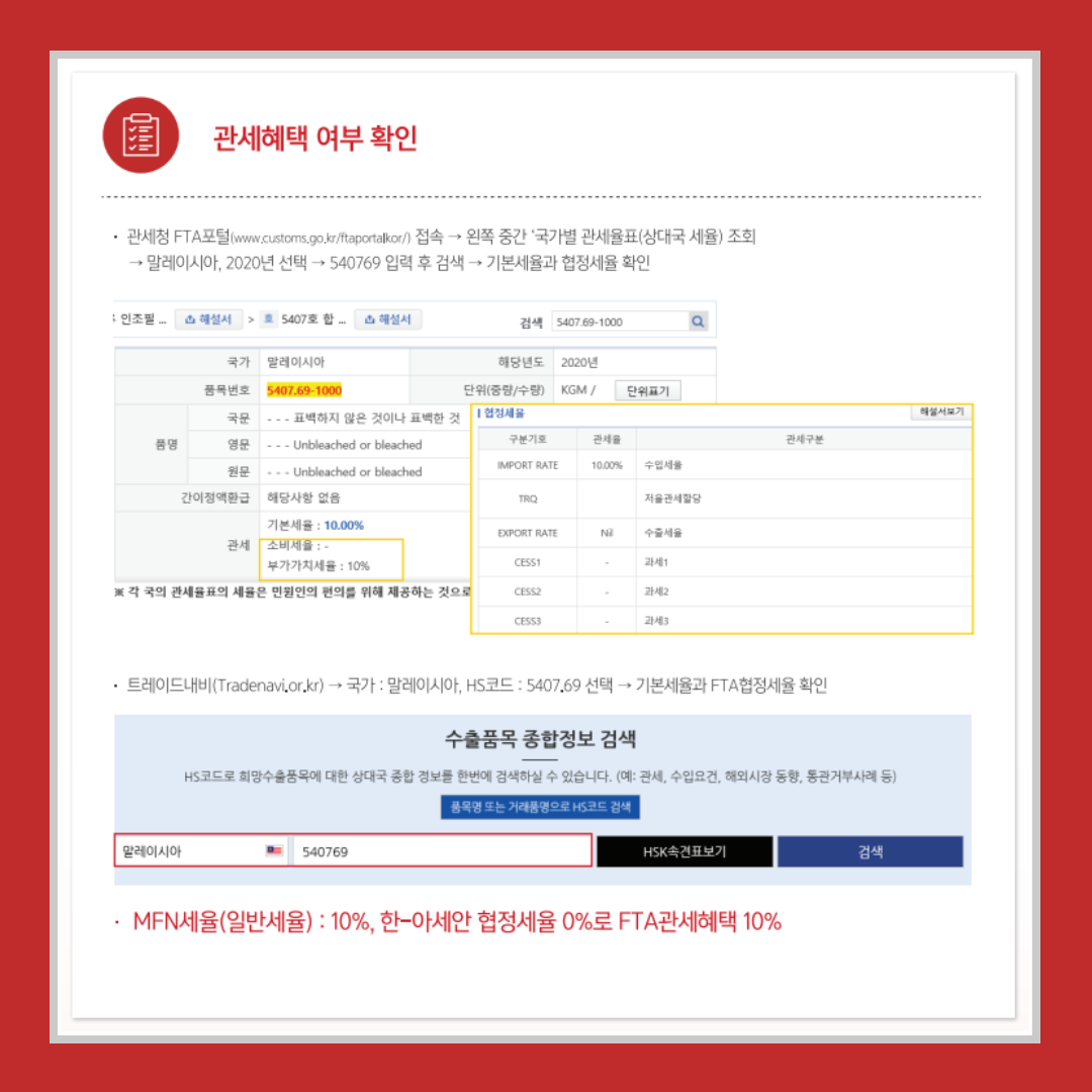 · 트레이드내비( http://www.tradenavi.or.kr ) → 국가 : 말레이시아, HS코드 : 5407.69 선택 → 기본세율과 FTA 협정세율 확인