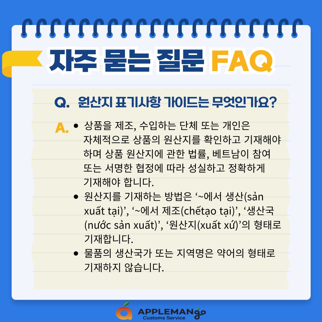- 원산지를 기재하는 방법은 ‘~에서 생산(sản xuất tại)’, ‘~에서 제조(chếtạo tại)’, ‘생산국(nước sản xuất)’, ‘원산지(xuất xứ)’의 형태로 기재합니다.