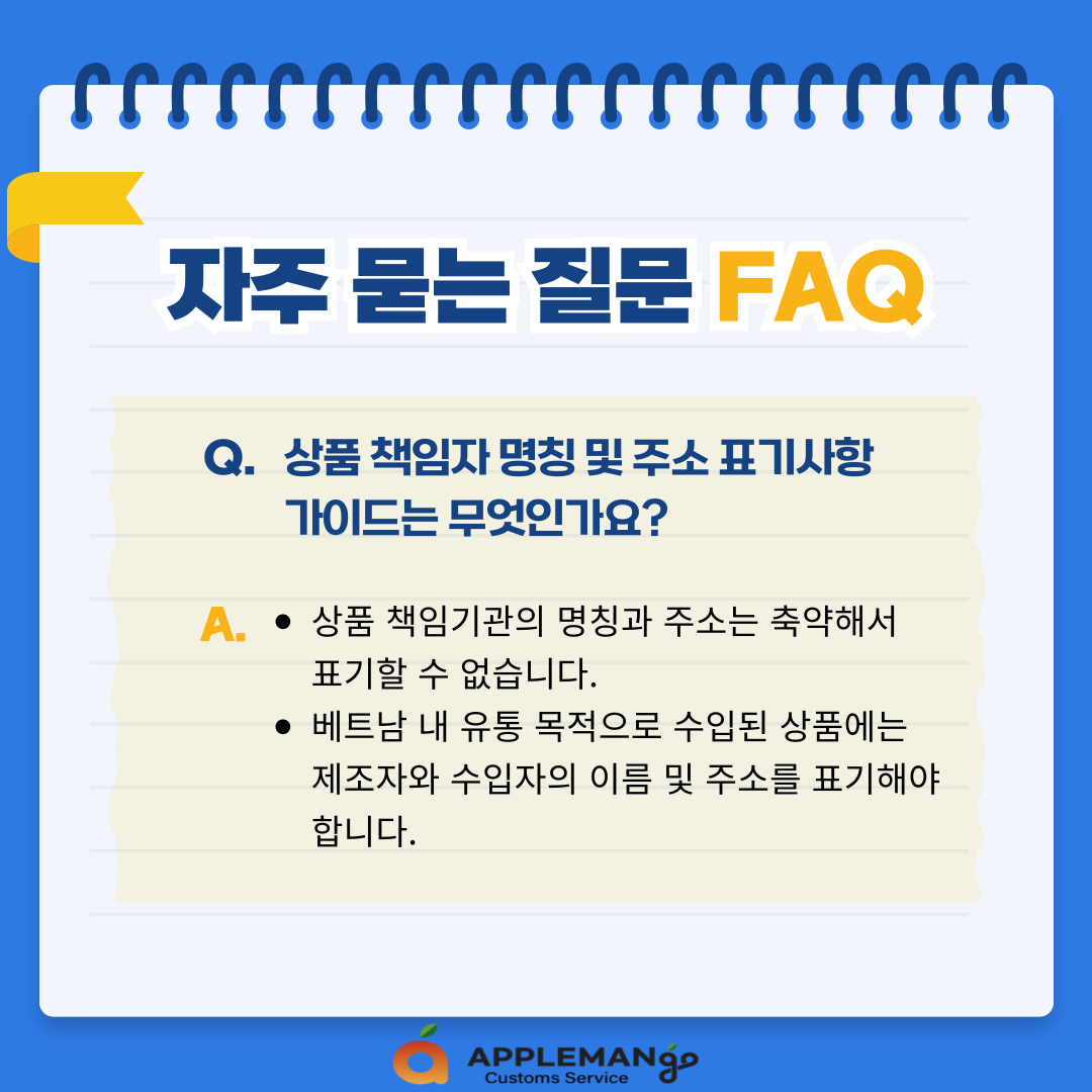 - 베트남 내 유통 목적으로 수입된 상품에는 제조자와 수입자의 이름 및 주소를 표기해야 합니다.