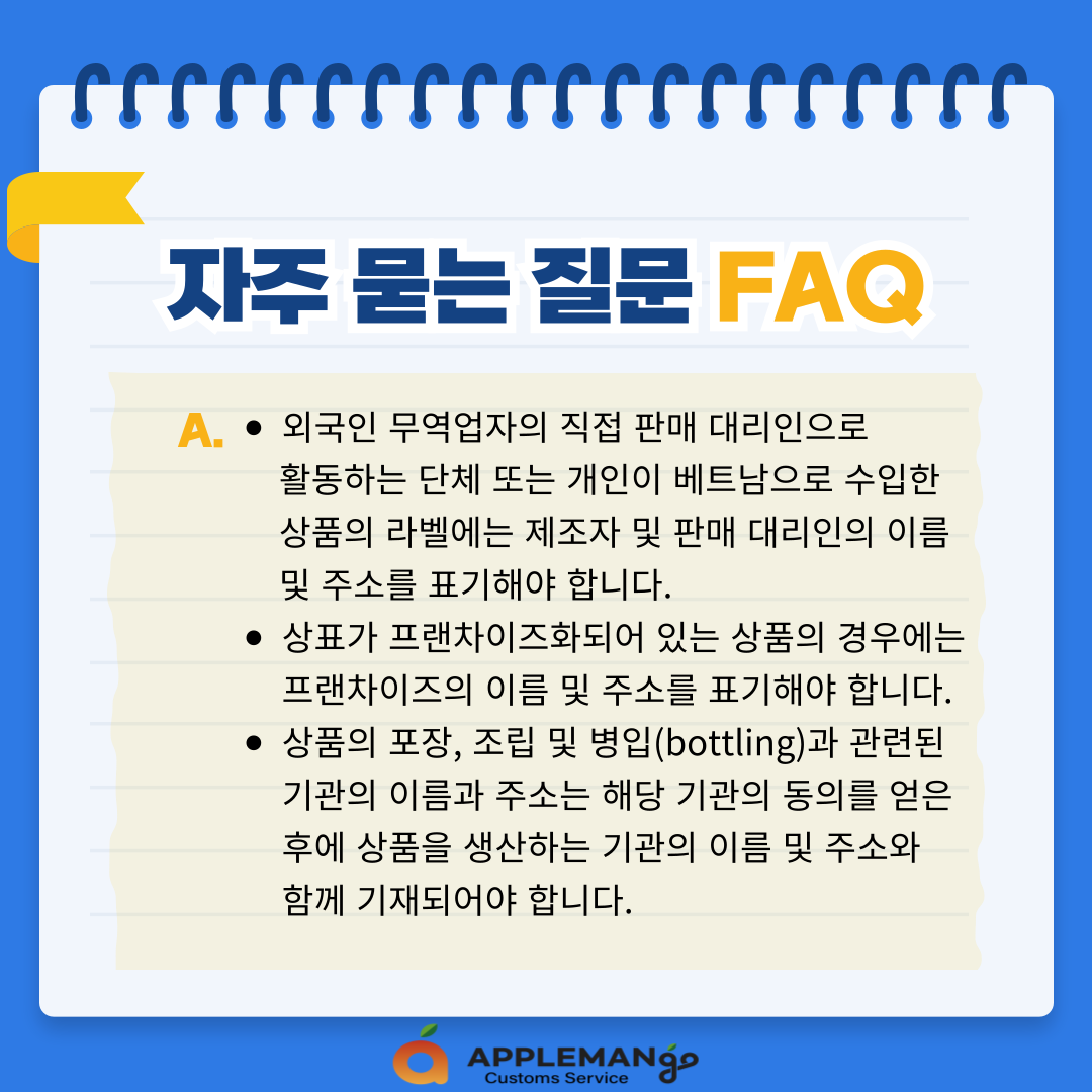 - 외국인 무역업자의 직접 판매 대리인으로 활동하는 단체 또는 개인이 베트남으로 수입한상품의 라벨에는 제조자 및 판매 대리인의 이름 및 주소를 표기해야 합니다.