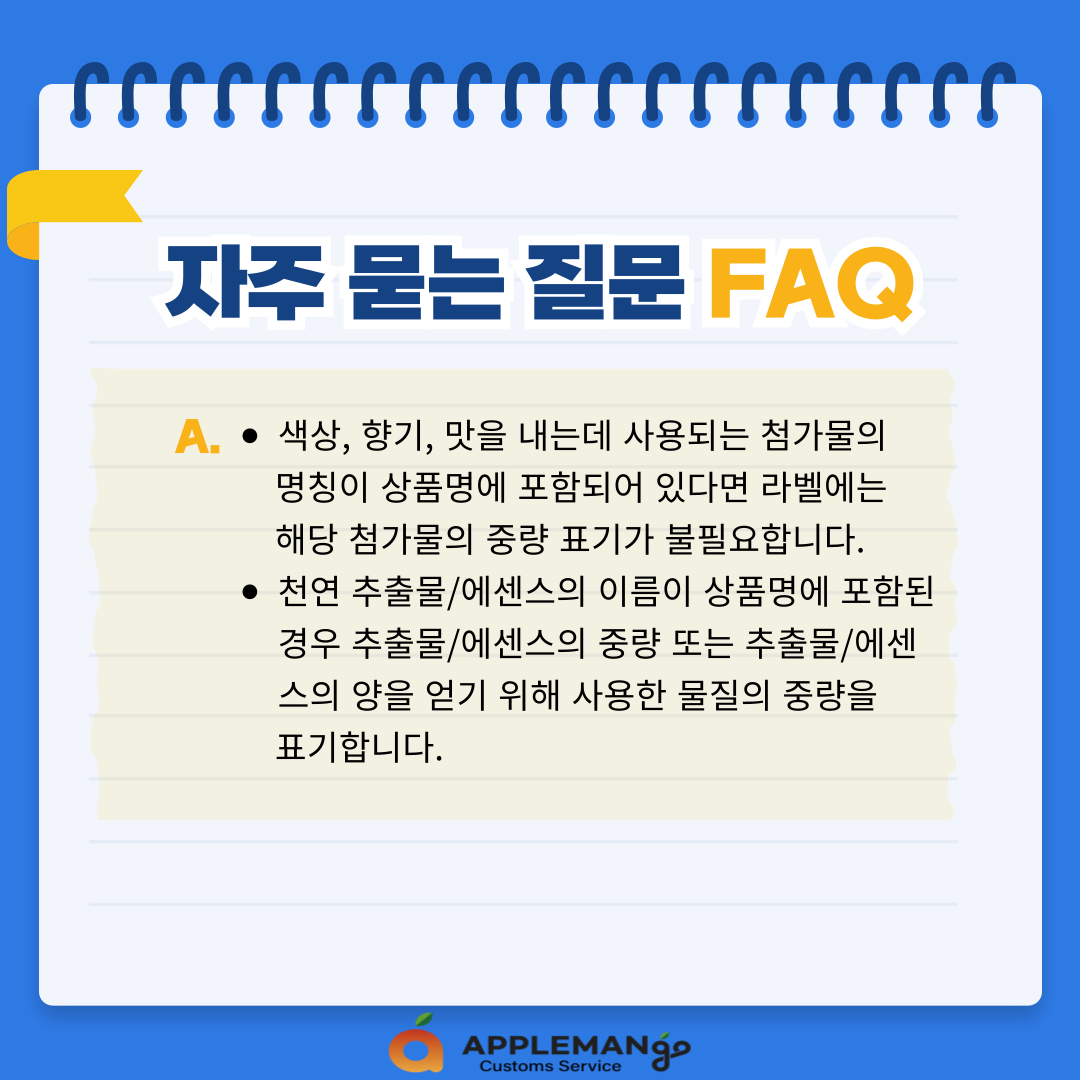 - 색상, 향기, 맛을 내는데 사용되는 첨가물의 명칭이 상품명에 포함되어 있다면 라벨에는해당 첨가물의 중량 표기가 불필요합니다.