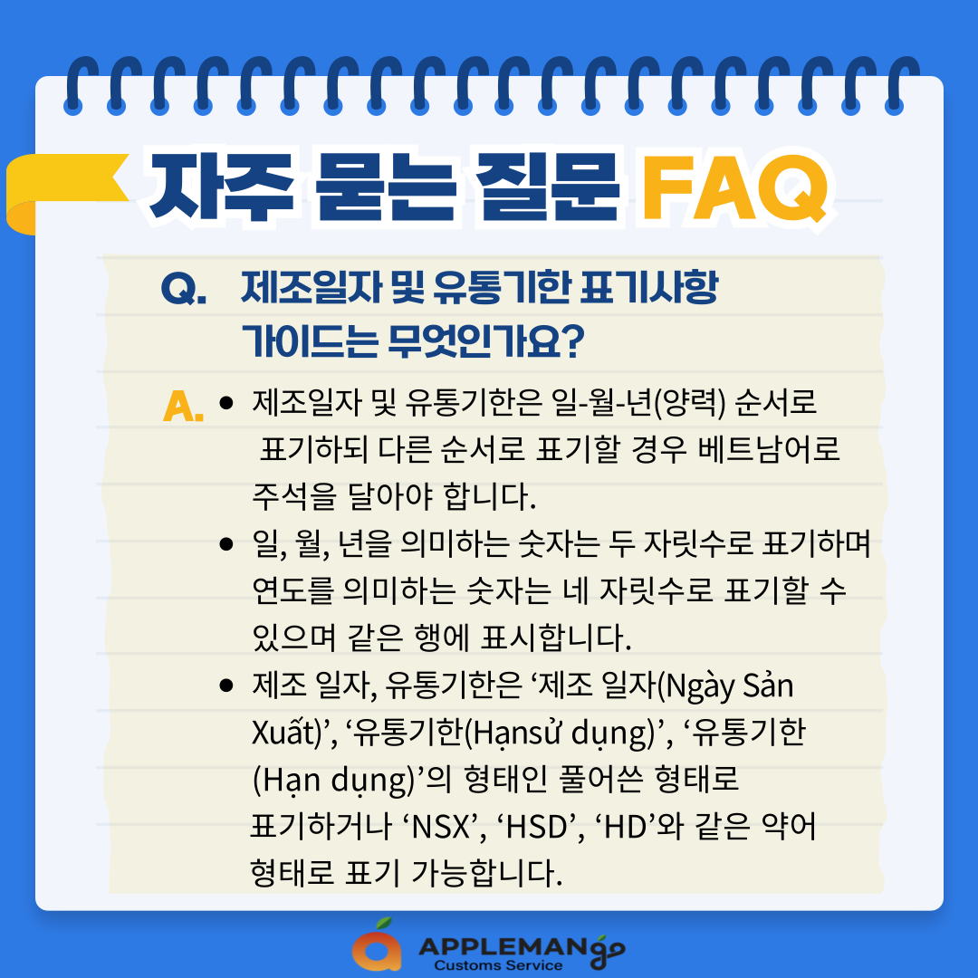 A. - 제조일자 및 유통기한은 일-월-년(양력) 순서로 표기하되 다른 순서로 표기할 경우 베트남어로 주석을 달아야 합니다.