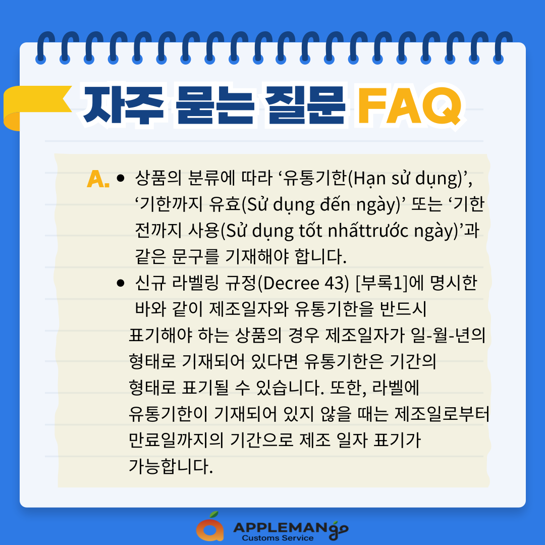 - 신규 라벨링 규정(Decree 43) [부록1]에 명시한 바와 같이 제조일자와 유통기한을 반드시 표기해야 하는 상품의 경우 제조일자가 일-월-년의 형태로 기재되어 있다면 유통기한은 기간의 형태로 표기될 수 있습니다. 또한, 라벨에 유통기한이 기재되어 있지 않을 때는 제조일로부터 만료일까지의 기간으로 제조 일자 표기가 가능합니다.