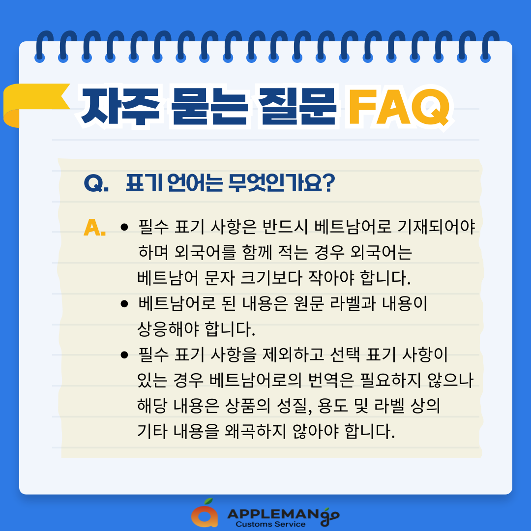 A. - 필수 표기 사항은 반드시 베트남어로 기재되어야 하며 외국어를 함께 적는 경우 외국어는 베트남어 문자 크기보다 작아야 합니다.