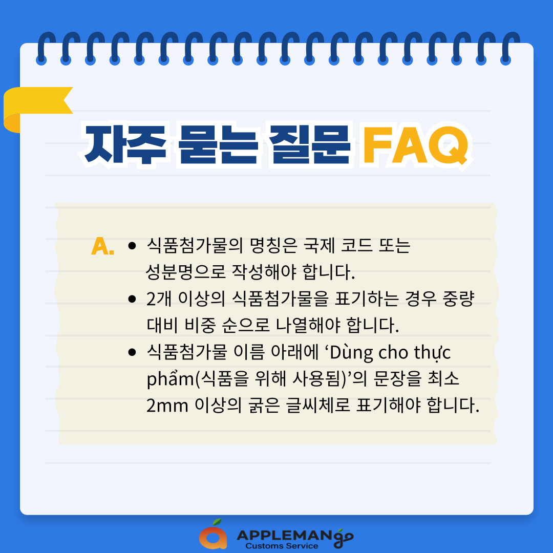 - 식품첨가물 이름 아래에 ‘Dùng cho thực phẩm(식품을 위해 사용됨)’의 문장을 최소 2mm 이상의 굵은 글씨체로 표기해야 합니다.