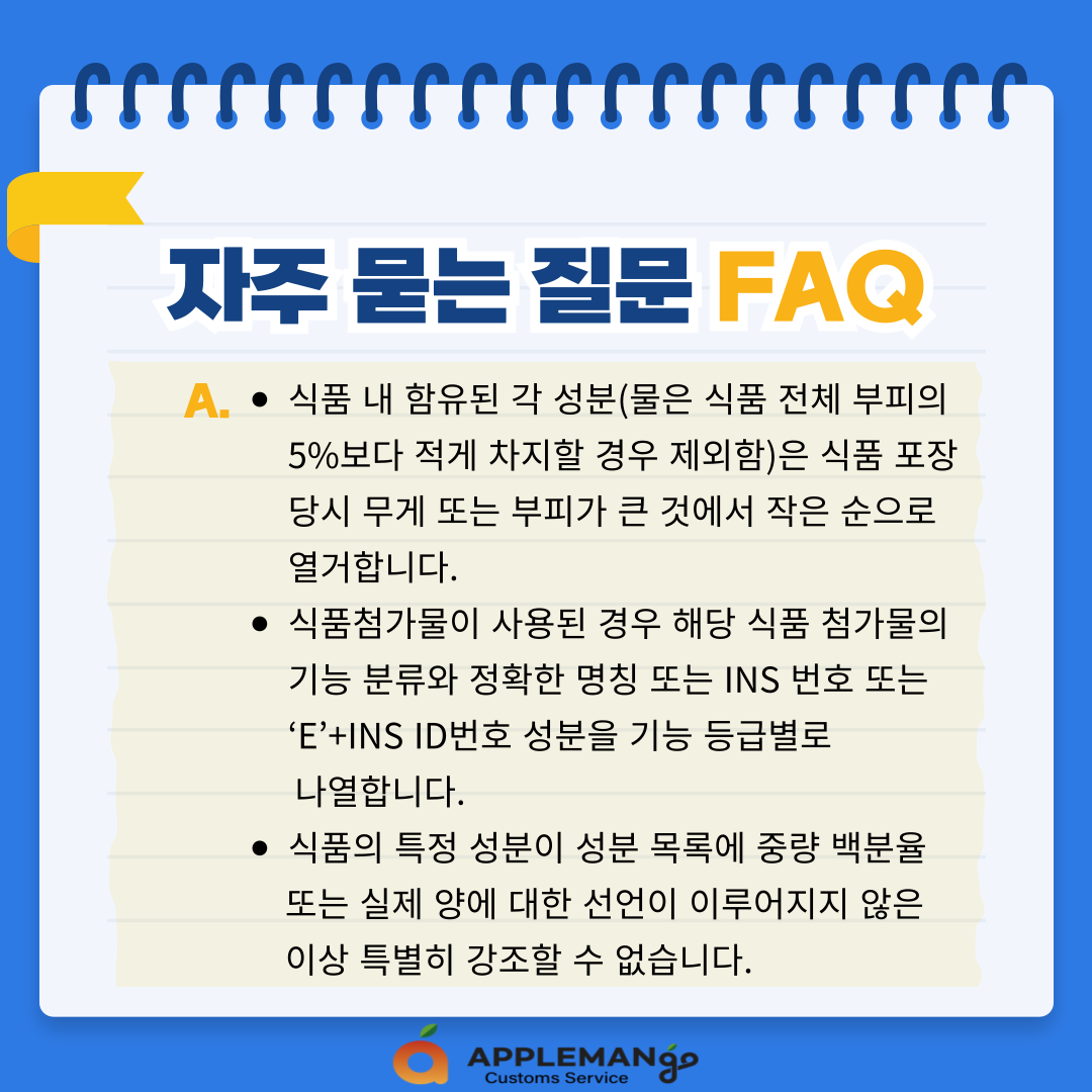 - 식품 내 함유된 각 성분(물은 식품 전체 부피의 5%보다 적게 차지할 경우 제외함)은 식품 포장 당시 무게 또는 부피가 큰 것에서 작은 순으로 열거합니다.