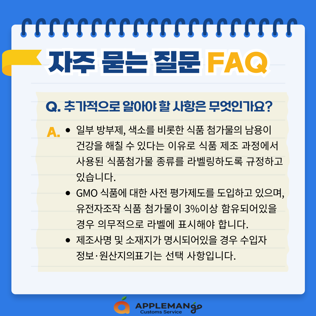 - GMO 식품에 대한 사전 평가제도를 도입하고 있으며, 유전자조작 식품 첨가물이 3%이상 함유되어있을 경우 의무적으로 라벨에 표시해야 합니다.