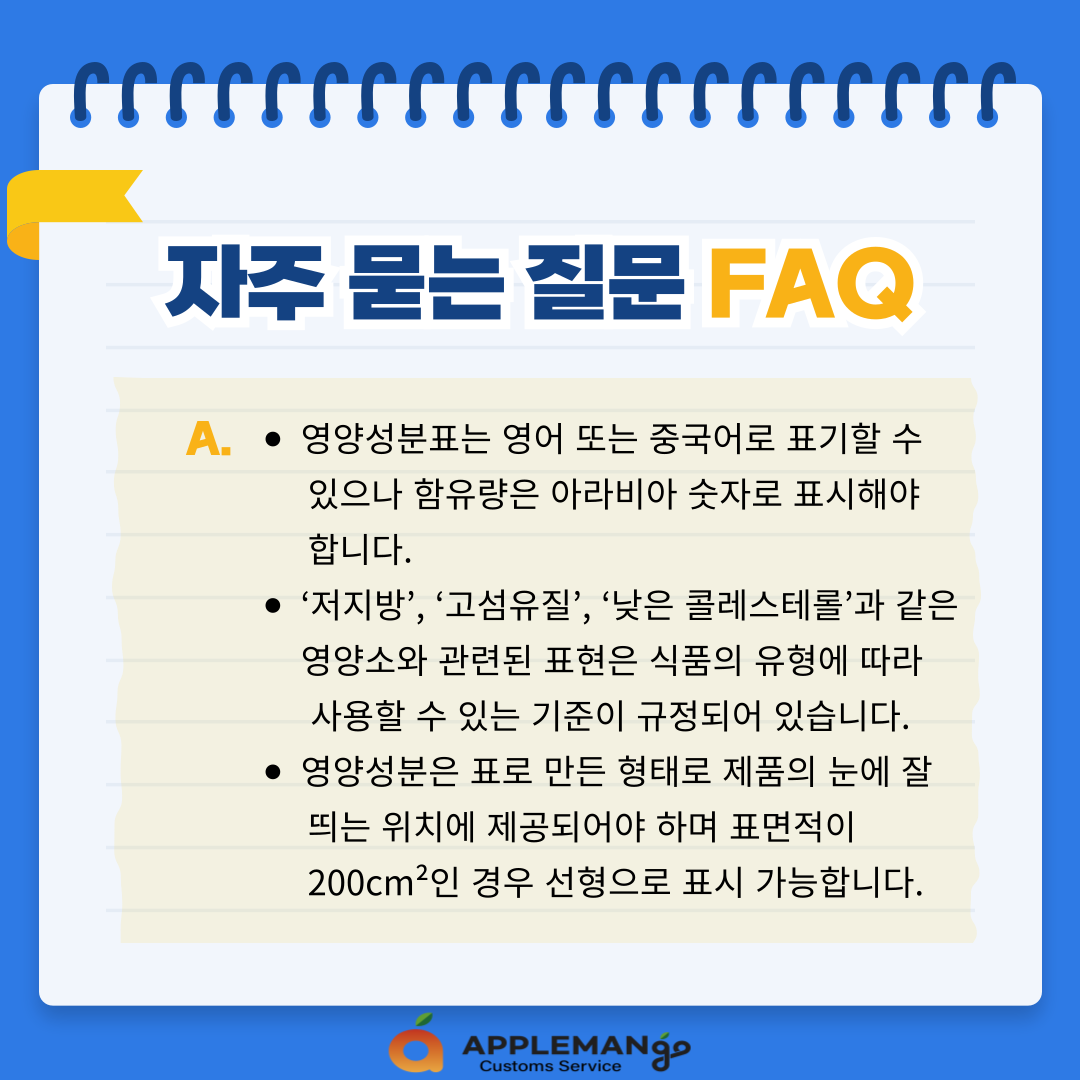 - 영양성분은 표로 만든 형태로 제품의 눈에 잘 띄는 위치에 제공되어야 하며 표면적이200cm²인 경우 선형으로 표시 가능합니다.