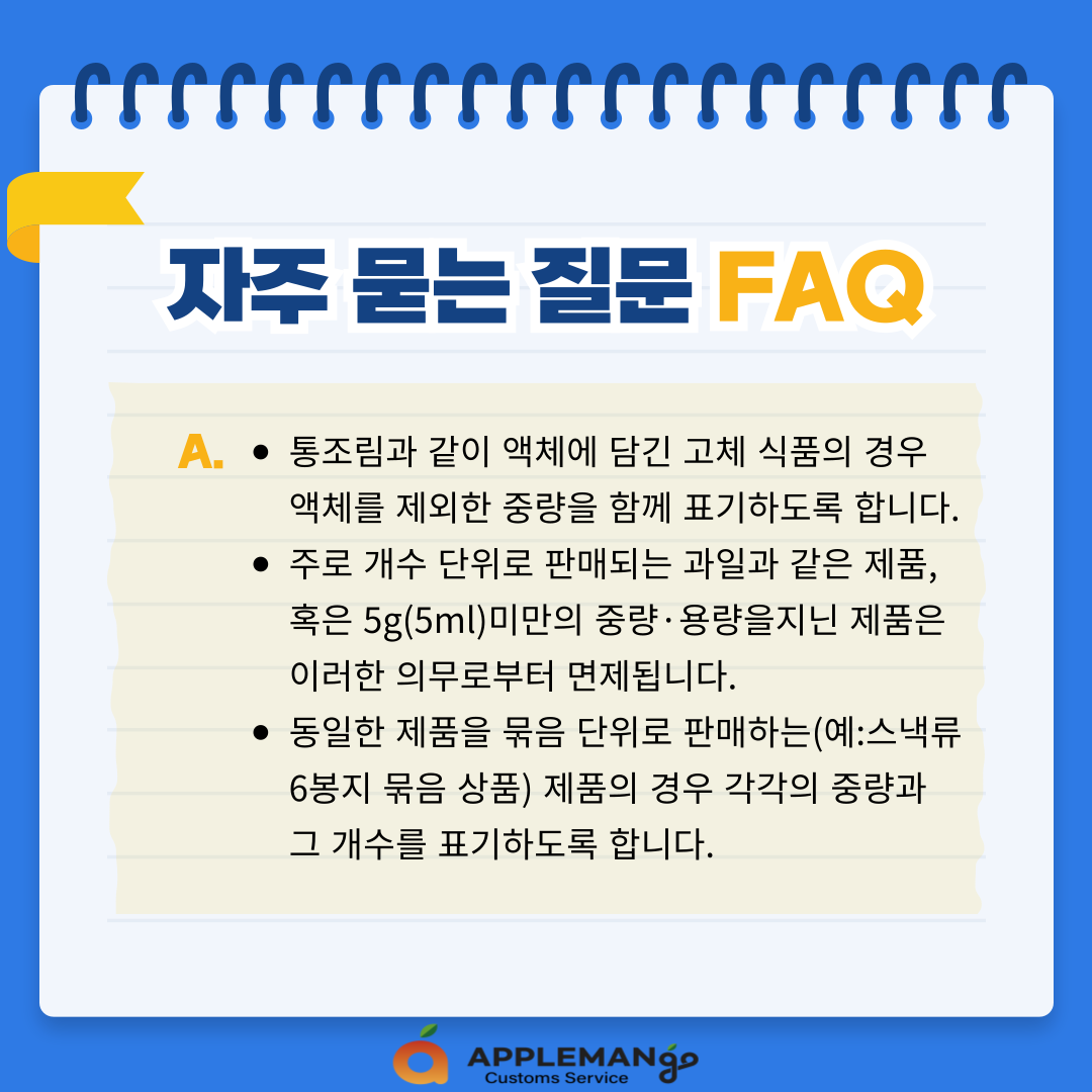 - 통조림과 같이 액체에 담긴 고체 식품의 경우 액체를 제외한 중량을 함께 표기하도록 합니다.