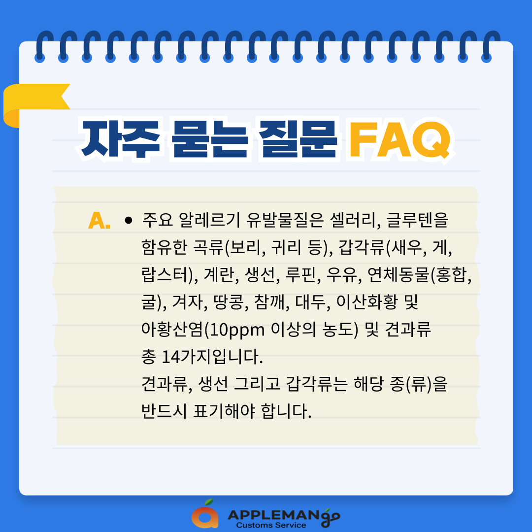 견과류, 생선 그리고 갑각류는 해당 종(류)을 반드시 표기해야 합니다.