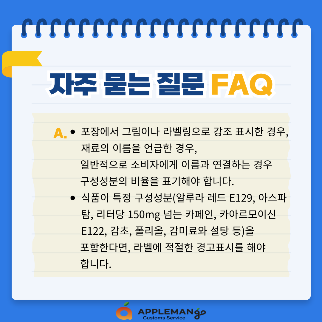 - 포장에서 그림이나 라벨링으로 강조 표시한 경우, 재료의 이름을 언급한 경우 일반적으로 소비자에게 이름과 연결하는 경우 구성성분의 비율을 표기해야 합니다.