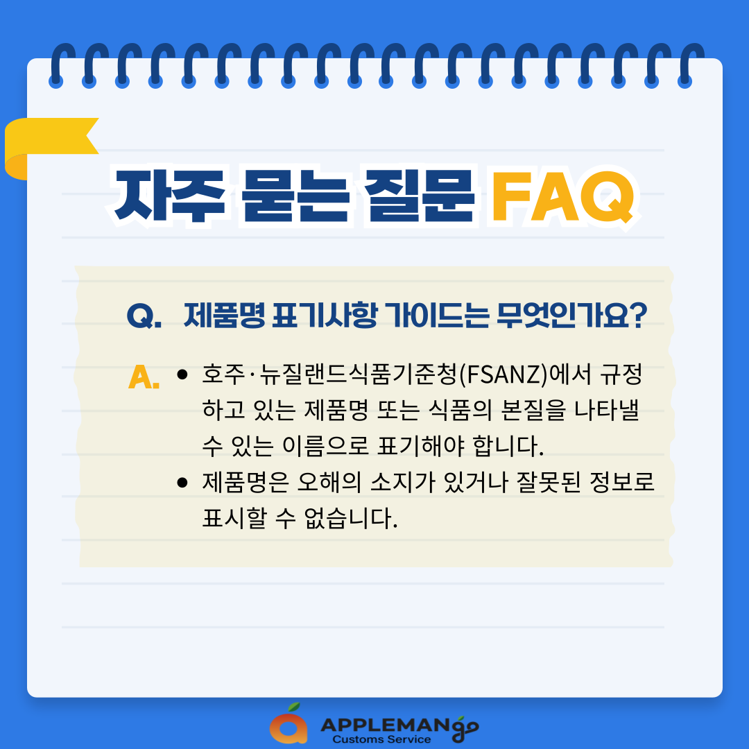 A. - 호주·뉴질랜드 식품기준청(FSANZ)에서 규정하고 있는 제품명 또는 식품의 본질을 나타낼 수 있는 이름으로 표기해야 합니다.