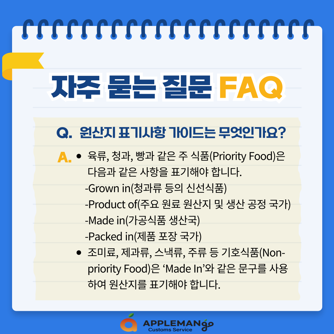 - 조미료, 제과류, 스낵류, 주류 등 기호식품(Non-priority Food)은 ‘Made In’와 같은 문구를 사용하여 원산지를 표기해야 합니다.