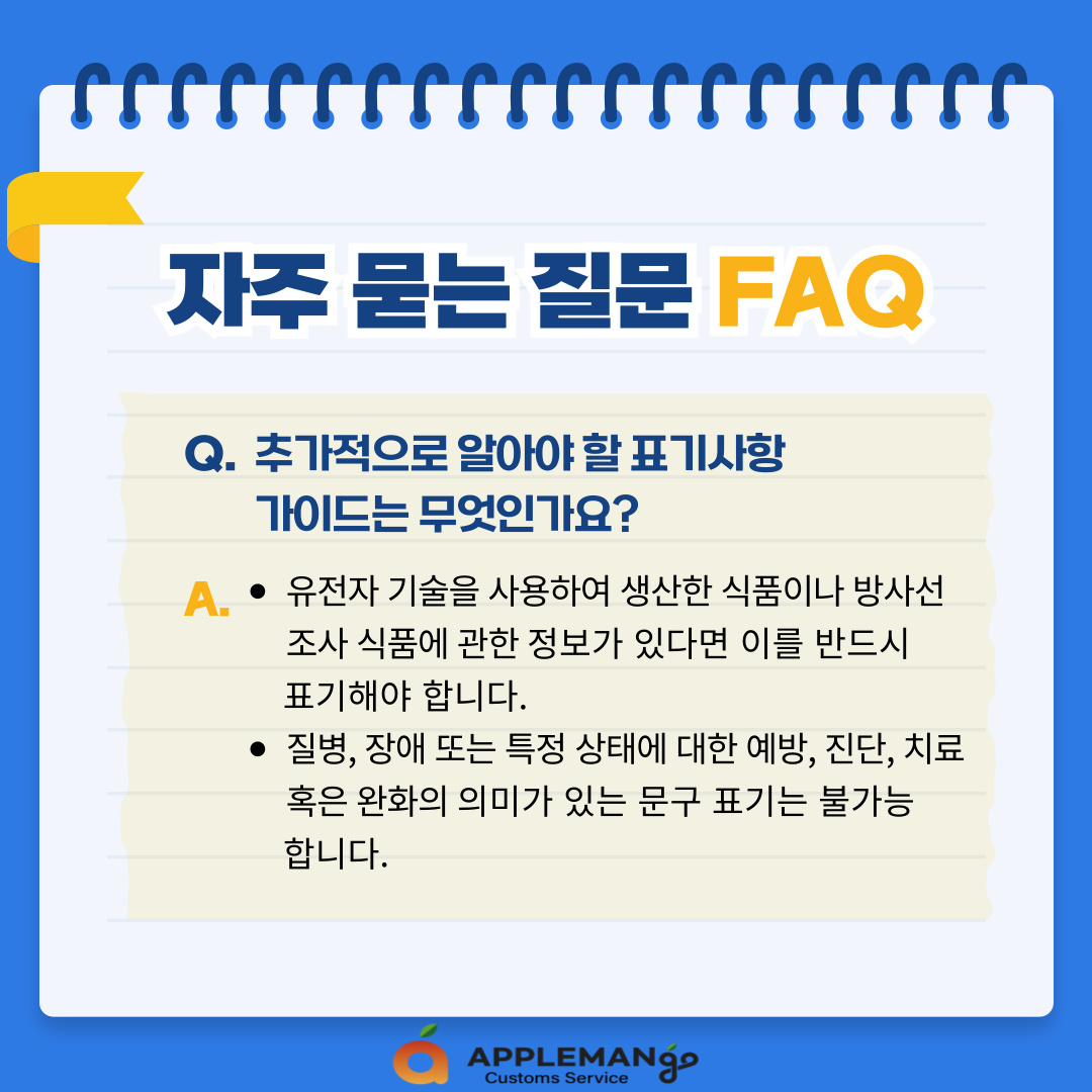 - 제품의 섭취 시 건강과 관련하여 소비자가 알아야 하는 내용 등 경고 표기는 필수입니다.