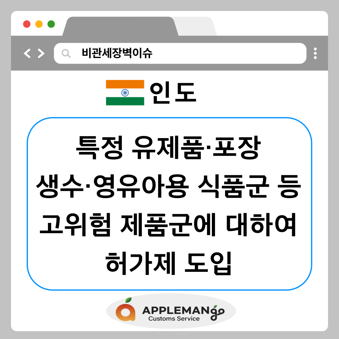 인도 - 특정 유제품·포장 생수·영유아용 식품군 등 고위험 제품군에 대하여 허가제 도입