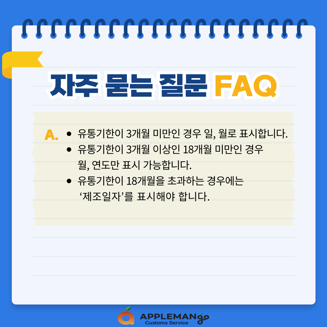 - 유통기한이 18개월을 초과하는 경우에는 ‘제조일자’를 표시해야 합니다.