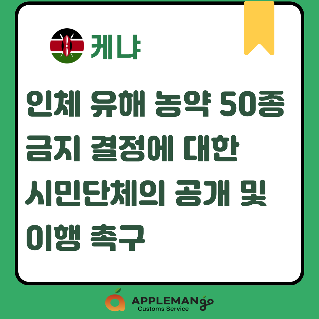 2025년 5월 7일, 케냐 농축산개발부(MALD, Ministry of Agriculture and Livestock Development)의 무타히 카그웨 장관은 나쿠루 카운티 몰로에서 열린 유관 행사에서 “수출국에서 이미 금지된 50종 이상의 유해 농약 제품을 케냐 시장에서 퇴출하겠다”고 발표 함. 그러나 현재까지 구체적인 금지 농약 목록은 공개되지 않음. 이에 시민단체들은 2025년 5월 15일 공동성명 발표를 통해 정부에 해당 목록의 공개와 금지 조치의 철저한 이행을 촉구함