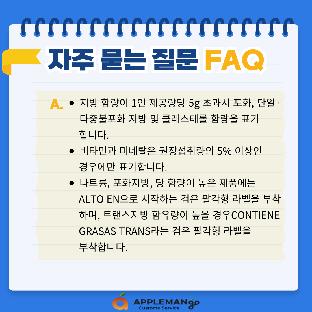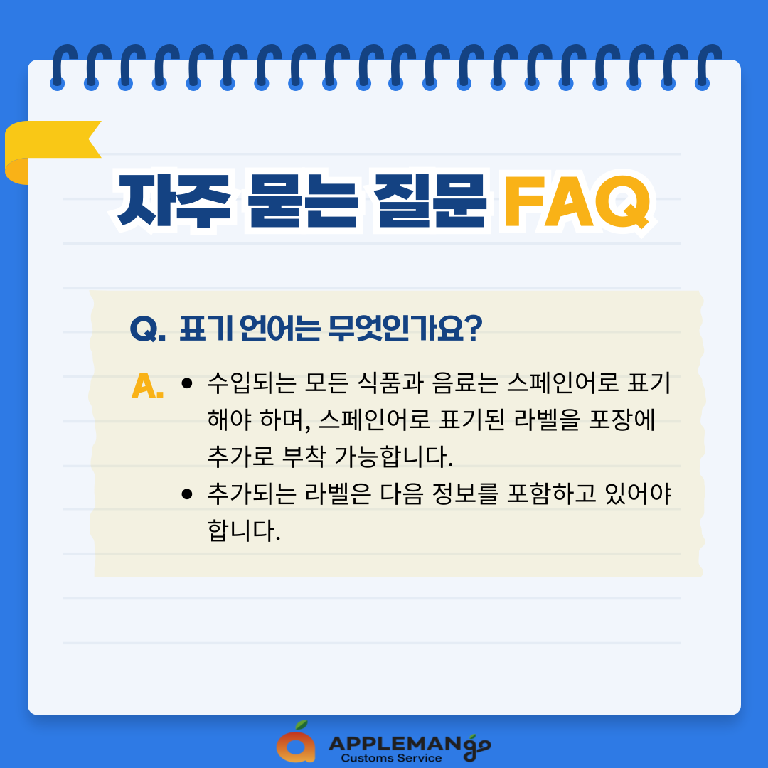 A. - 수입되는 모든 식품과 음료는 스페인어로 표기해야 하며, 스페인어로 표기된 라벨을 포장에 추가로 부착 가능합니다.