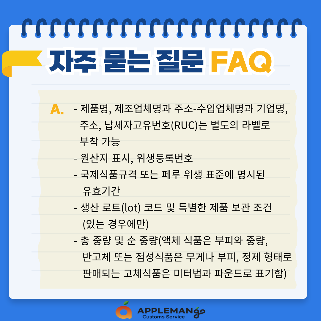 ▷ 제품명, 제조업체명과 주소-수입업체명과 기업명, 주소, 납세자고유번호(RUC)는 별도의 라벨로 부착 가능