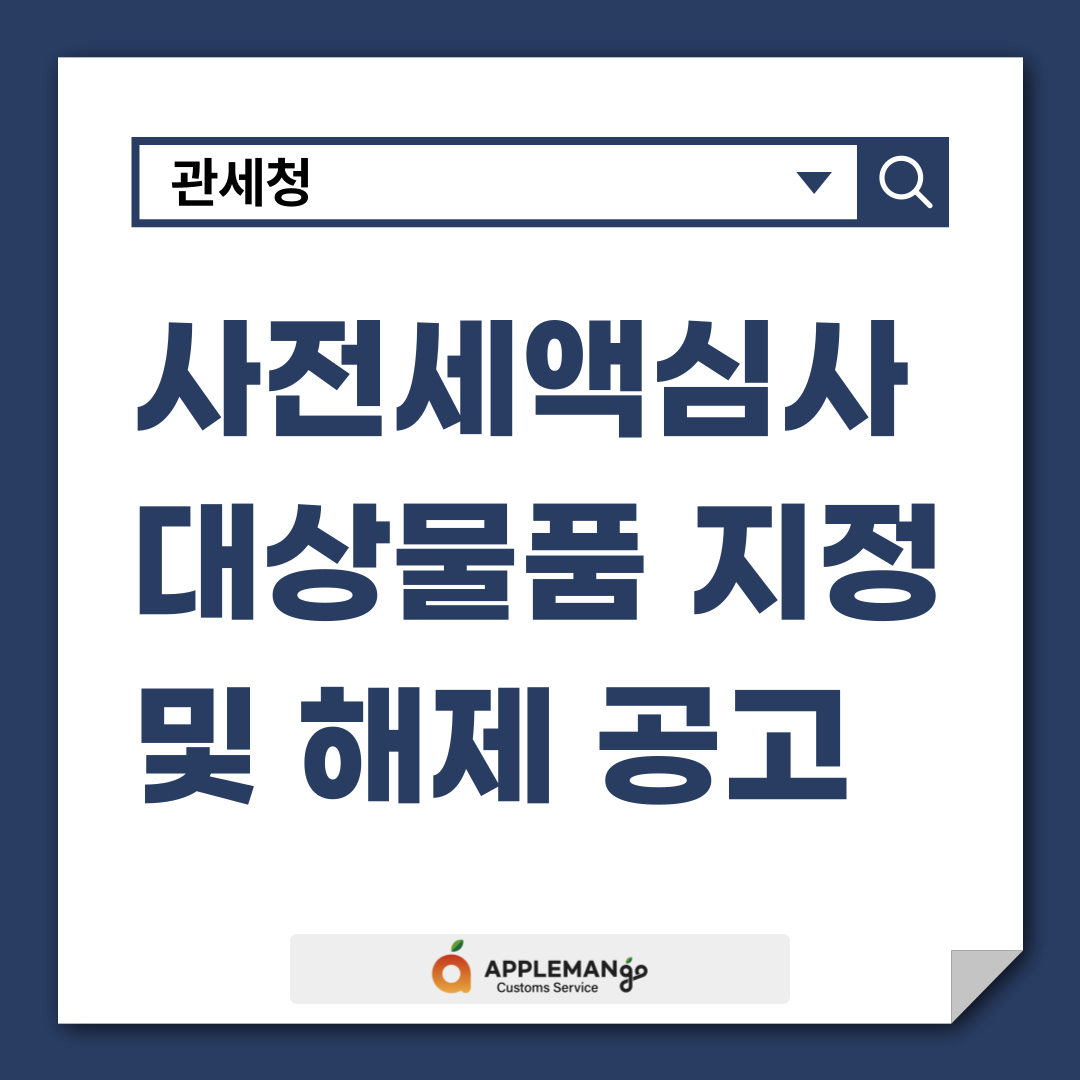 「관세법」제38조제2항, 같은 법 시행규칙 제8조제1항제5호,「납세업무 처리에 관한 고시」제49조제4항 및 제50조제3항에 따라 사전세액심사 추가 지정 및 해제 품목을 다음과 같이 공고합니다.