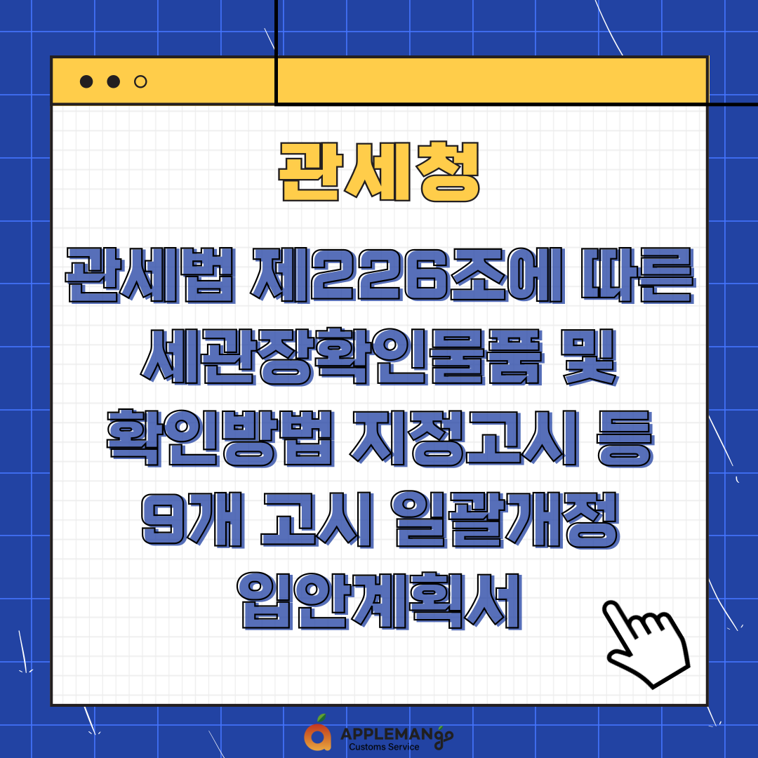 관세청, 관세법 제226조에 따른 세관장확인물품 및 확인방법 지정고시 등 9개 고시 일괄개정 입안계획서