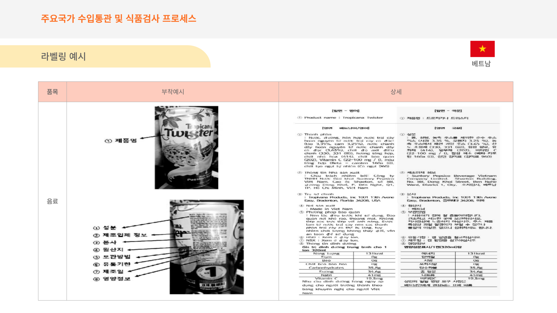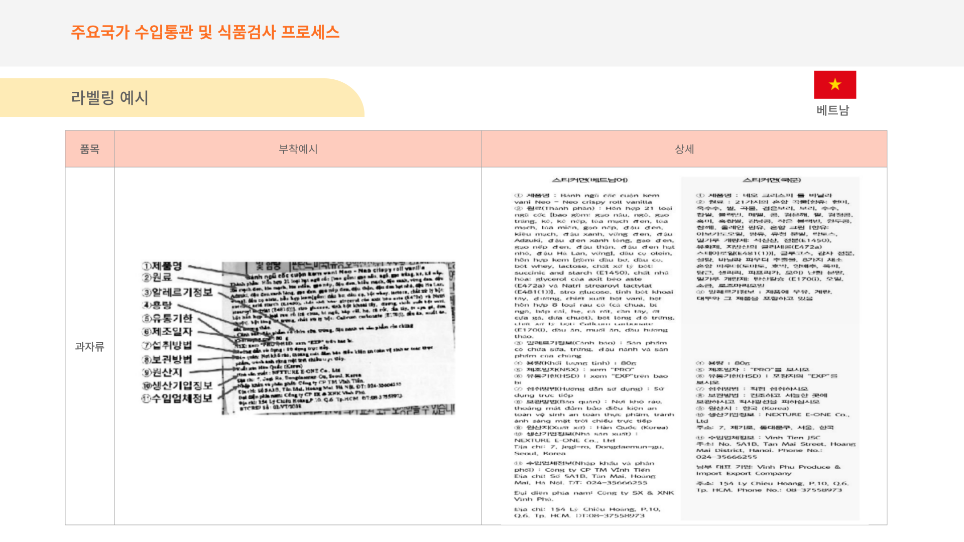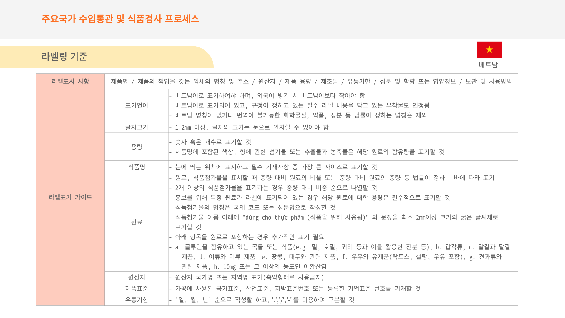 베트남 식약처에서 요구하는 라벨표시 기준입니다.