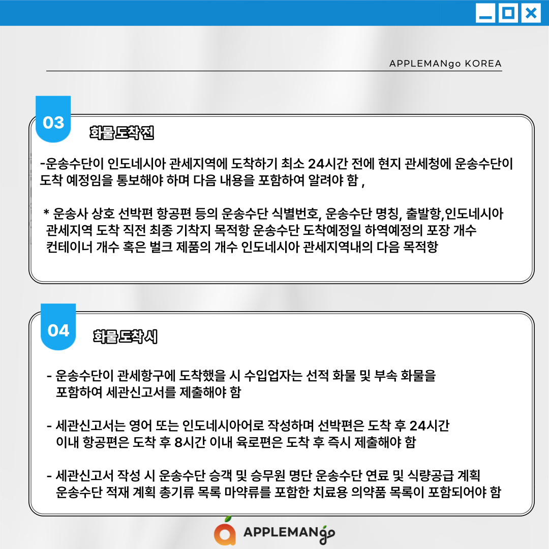 운송수단이 인도네시아 관세지역에 도착하기 최소 24시간 전에