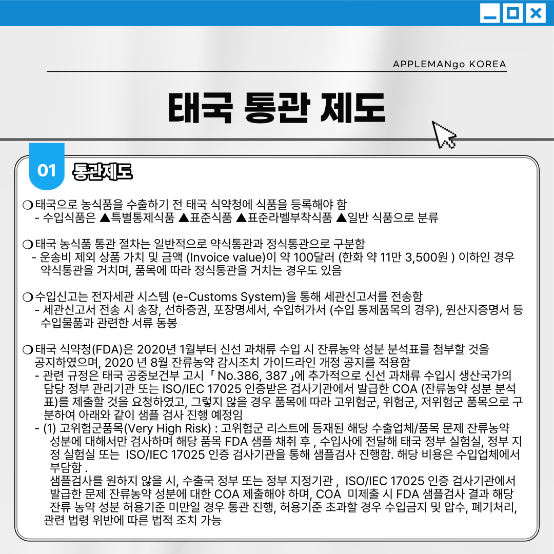 태국 식약청(FDA)은 2020년 1월부터 신선 과채류 수입 시 잔류농약 성분