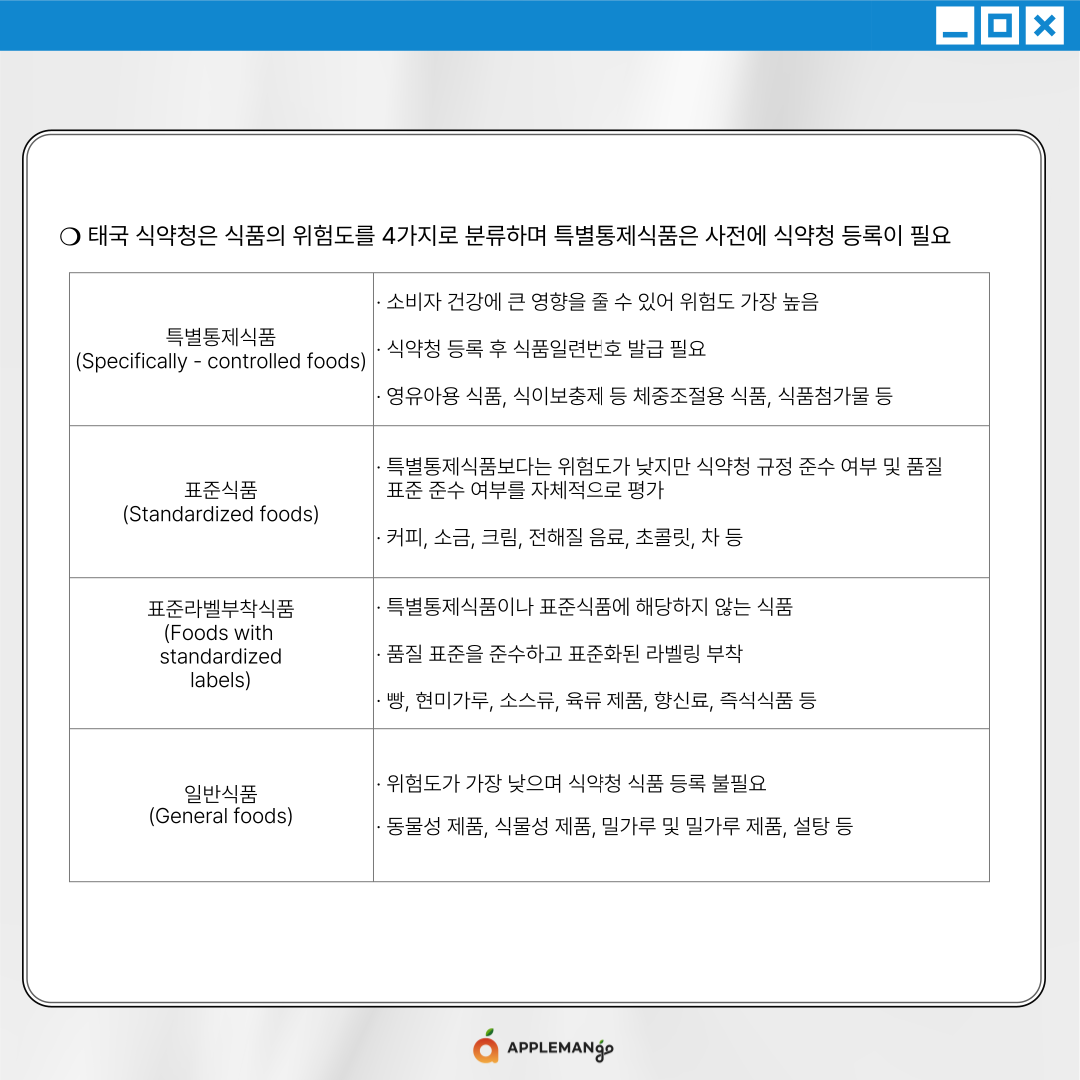 태국 식약청은 식품의 위험도를 4가지로 분류하며