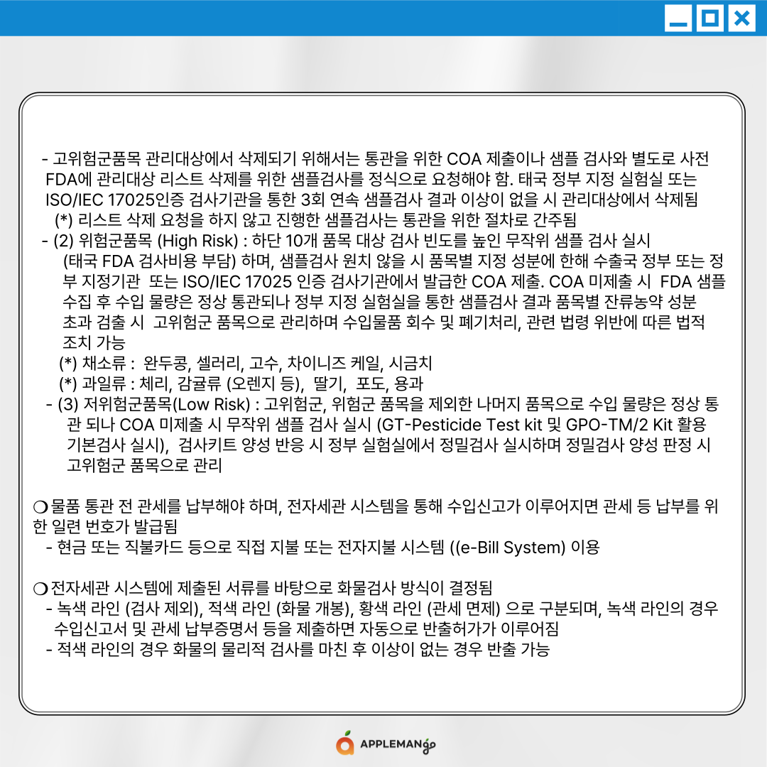 태국 농식품 통관 절차는 일반적으로 약식통관과 정식통관으로 구분함