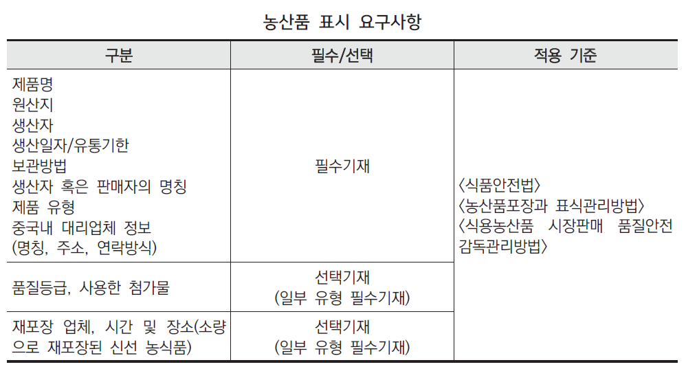 ○ 농산품 표시에 사용할 문자는 규범화된 중문을 사용하여야 한다. 표식, 표기된 내용은 정확하고 진실성이 있으며 뚜렷해야 한다.