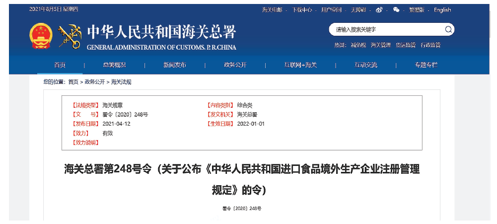 ○ 2021년 4월12일, 중국 해관총서는 수출입 식품에 대한 관리 · 감독을 강화하기 위하여 《수출입식품 안전관리방법, 이하 '관리방법'》을 개정함(시행일 : 2022년 1월 1일) 관리방법을 수입식품 및 해외 생산기업에 대해 강화된 심사관리방법을 규정하였으며, 이를 근거로 《수입식품 해외생산업체 등록관리규정, 이하'관리규정'》의 개정안도 발표됨