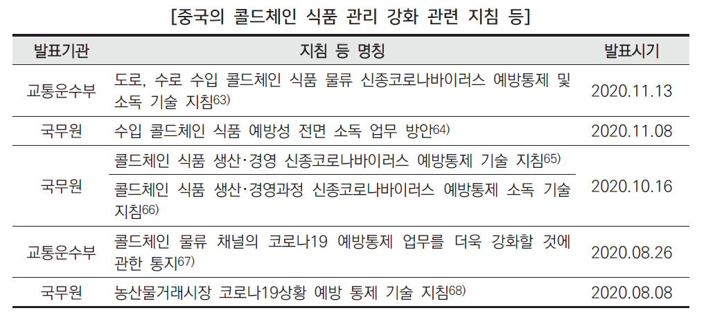 ○ '20년 9월, 해관총서는 신종코로나바이러스가 검출된 콜드체인 수입식품의 생산기업을 대상으로 한 '긴급예방조치'를 발표했음