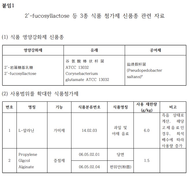 붙임 : 2'-fucosyllactose 등 3종 식품 첨가제 신품종 관련 자료 자료원: 식품안전리스크평가센터(2023.08.23.)