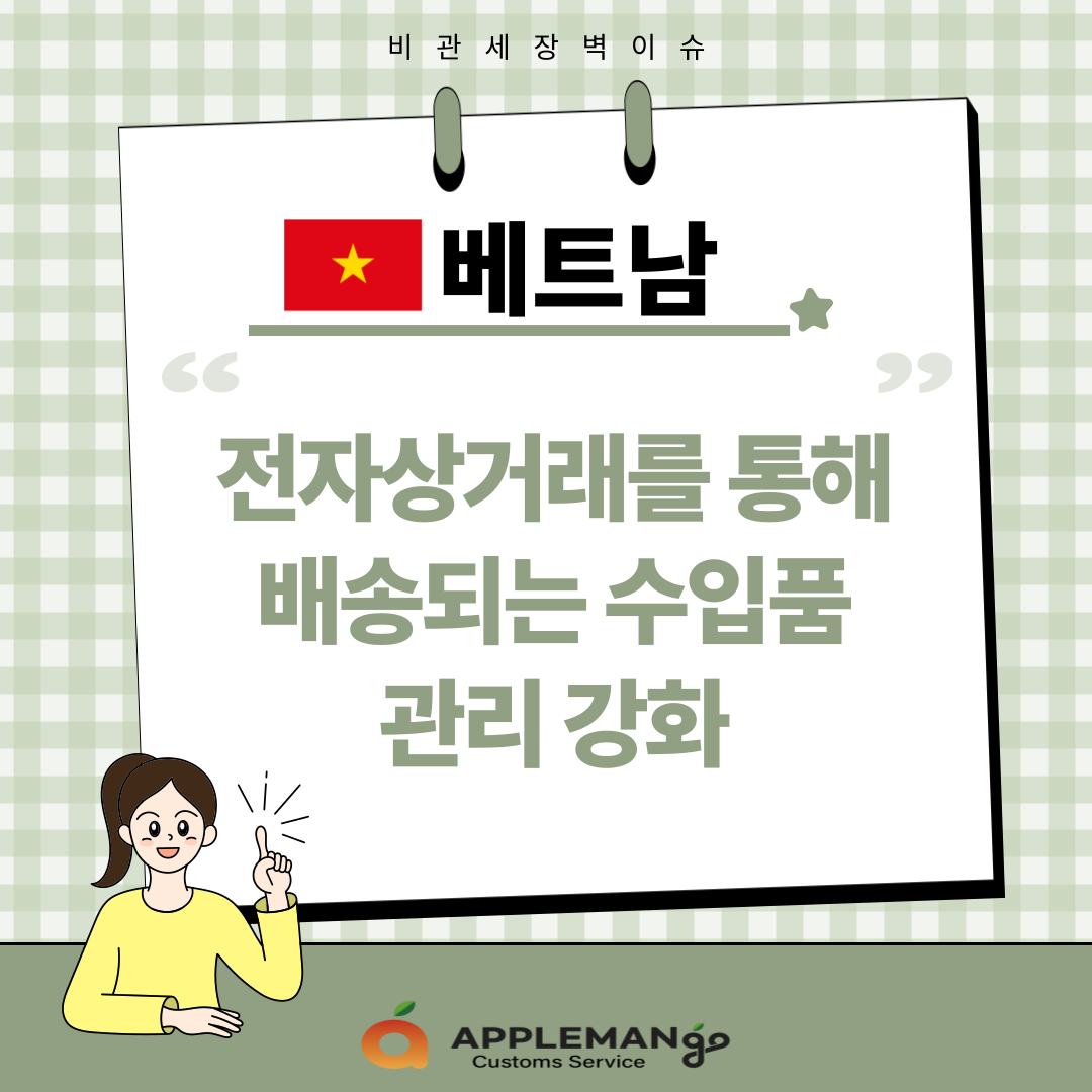 2024년 11월 8일, 베트남 관세청은 전자상거래를 통해 배송되는 수입품에 대한 관리 강화를 위해 각 지방 및 도시의 세관에 수입 상품에 대한 검사, 감독 및 통제를 강화하도록 요청함. 이는 최근 전자상거래를 통한 수입품 증가와 등록되지 않은 전자상거래 플랫폼의 활동 증가에 따른 것으로 위조 상품, 지식 재산권 침해 상품, 수입 요건을 충족하지 못하는 저품질 상품 거래에 의한 소비자 피해를 방지하고자 함