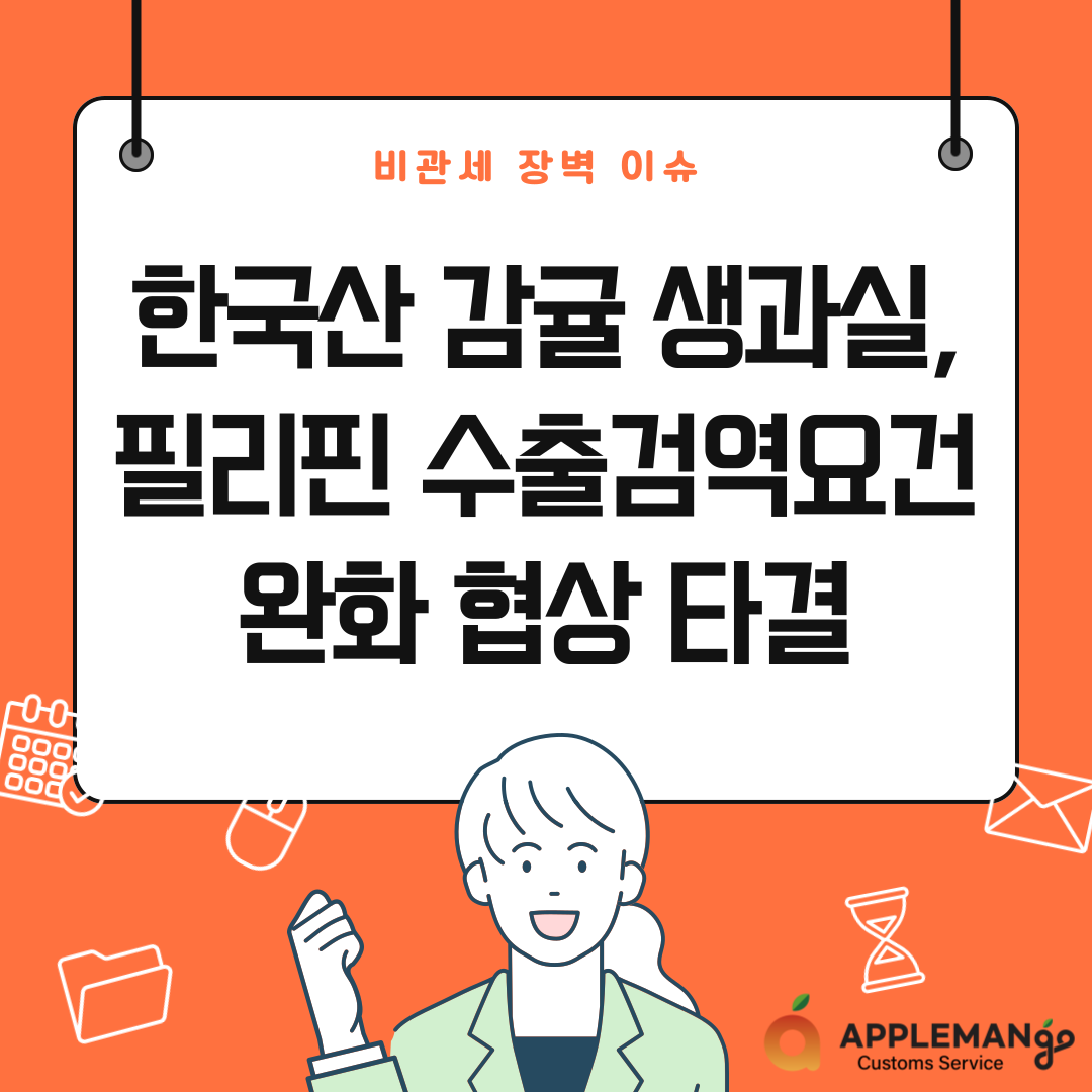 한국산 감귤 생과실은 2010년에 필리핀과 수출검역협상을 타결하였으나 선박화물로만 수출이 가능했고, 포장상자마다 봉인을 해야 했으며, 필리핀도착 후 수입검역 시 화물당 10%를 검역하는 등 수출요건이 까다로워 수출에 어려움이 있었다.
