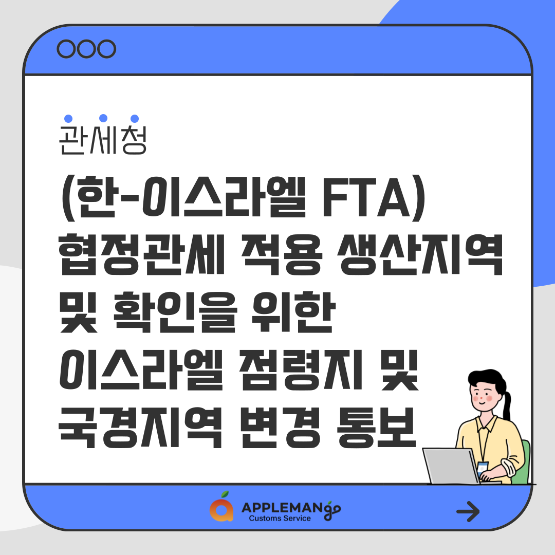 1. 「대한민국 정부와 이스라엘 정부 간의 자유무역협정에 따른 협정관세가 적용되는 이스라엘 생산지역 및 확인 방법에 관한 고시(제2024-56호, 2024.12.6.)」(이하 '이스라엘 고시') 제7조 관련입니다.