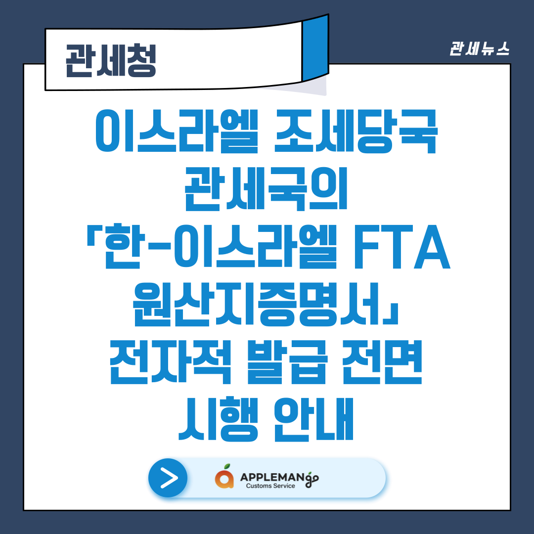 관세청, 이스라엘 조세당국 관세국의 「한-이스라엘 FTA 원산지증명서」 전자적 발급 전면 시행 안내