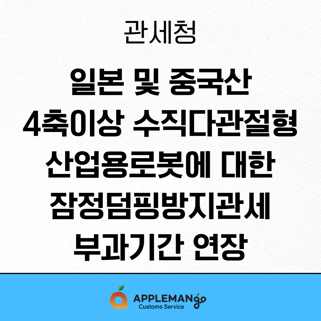 기획재정부고시 제2025-47호(2025.11.21. 시행)에 따른 다음의 일본 및 중국산 4축이상 수직다관절형 산업용로봇에 대한 잠정덤핑방지관세 부과 내용 중 관세법 시행령 제66조제3항에 따라 부과 기간을 당초 2025.11.21.∼2026.3.20.(4개월)에서 2025.11.21.∼2026.5.20.(6개월)로 연장함을 고시합니다.